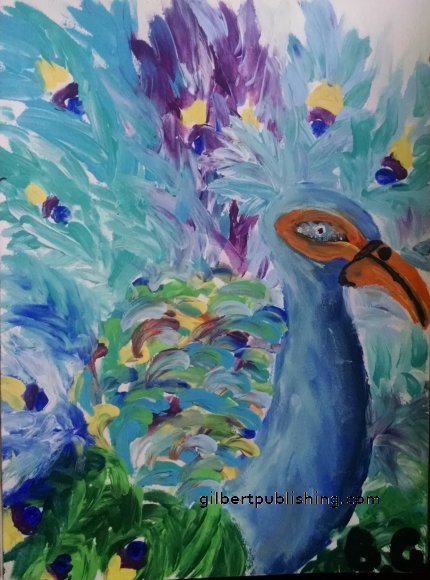 A finger painting using acrylic to portray an abstract peacock with vibrant colors.